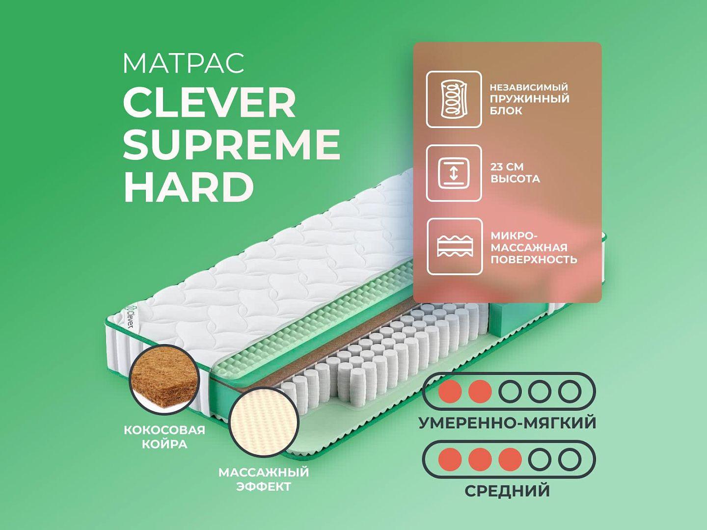 Фабрика Clever получила заслуженную репутацию, благодаря применению новых технологий и безупречному соблюдению стандартов качества. Clever Supreme Hard — образец продукта с лучшими характеристиками и доступной ценой, матрас создан из дышащих тканей, с эффектом вентиляции.